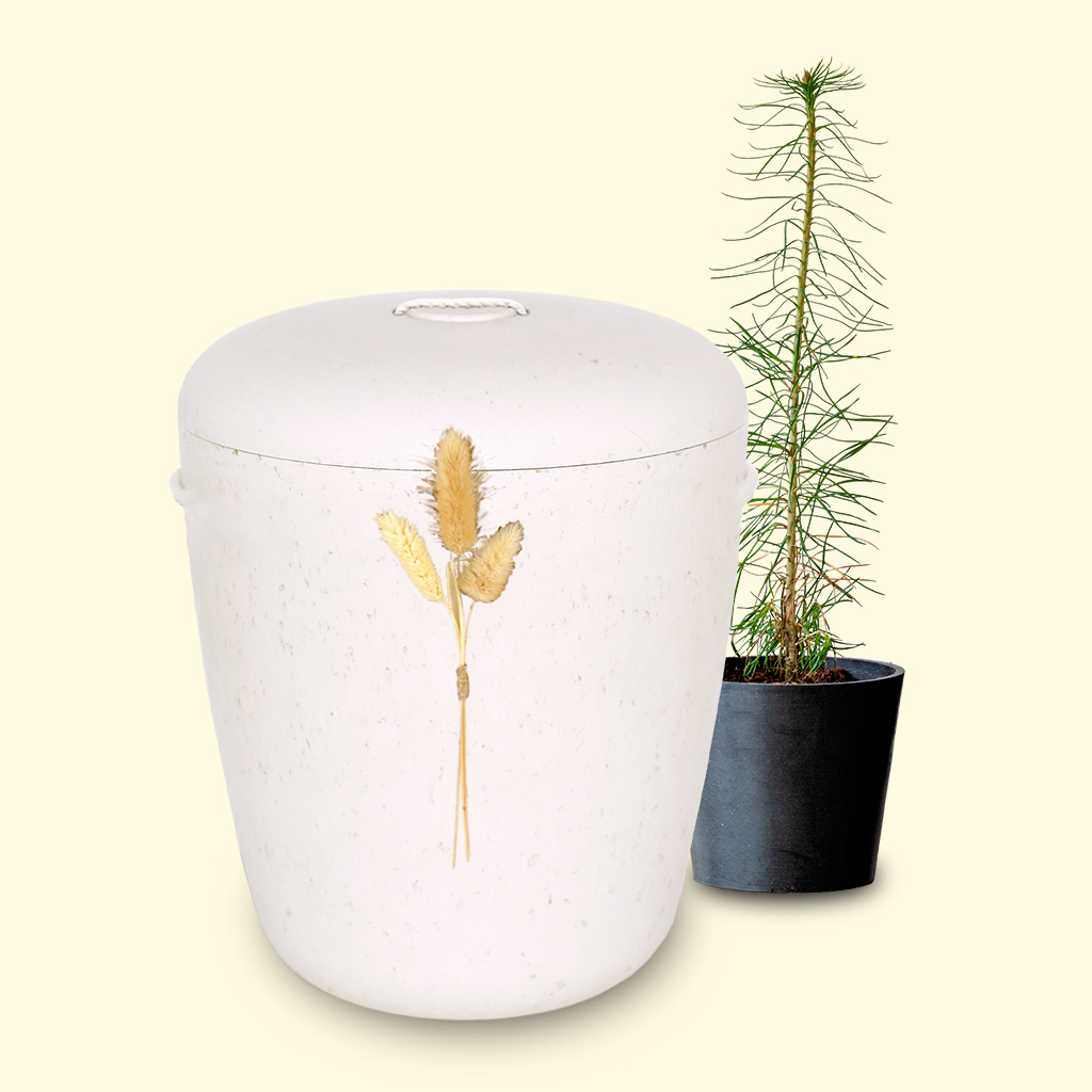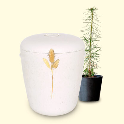 Tämä uurna valmistetaan puukuidusta, ja se on 100 % biohajoava.